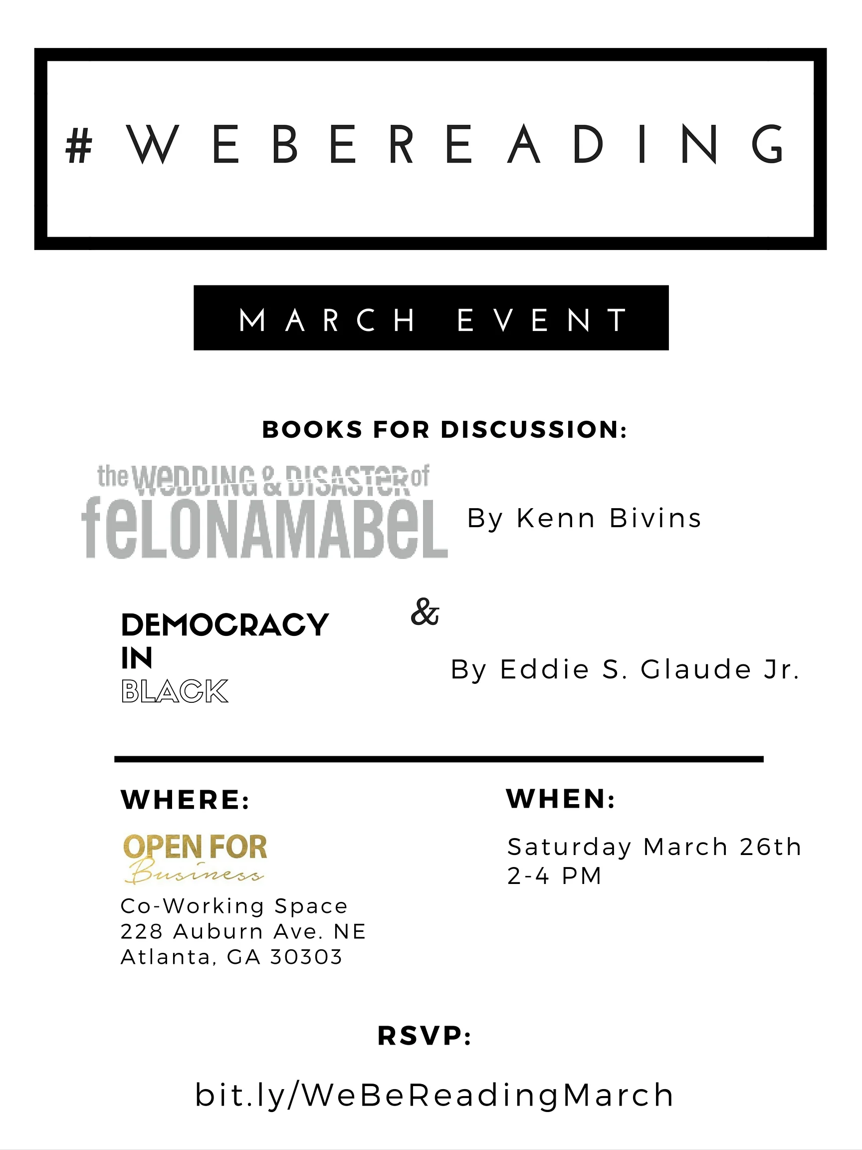 Mar 26 2:00 PM14:00 #WeBeReading - March Event Saturday, March 26, 2016 2:00 PM 4:00 PM 14:00 16:00 Open for Business (map) Google Calendar ICS Book Discussion for the Wedding & Disaster of felona Mabel by Kenn Bivins and Democracy in Black by Eddie Glaude Jr.Kenn Bivins will be in attendance for a special reading and question and answer session. View Event →